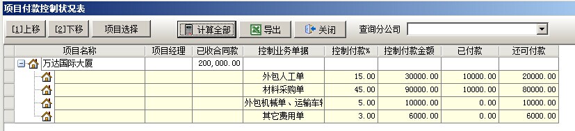 2. 假設(shè)【萬達(dá)國際大廈】項(xiàng)目,承包合同中累計(jì)收款金額為20萬,那么按控制比例得出的結(jié)果是:人工費(fèi)=200000*15%=30000、材料費(fèi)=2000000*45%=90000、外包機(jī)械運(yùn)輸車輛=10000、其他費(fèi)=6000,具體資金狀況我們可以在菜單二次開發(fā)中打開【項(xiàng)目資金控制狀況表】查看,其中包含了項(xiàng)目控制付款金額(根據(jù)上面的公式得出),已付款金額(根據(jù)累計(jì)付款單得出),還可付款(根據(jù)上面兩組數(shù)據(jù)得出)。