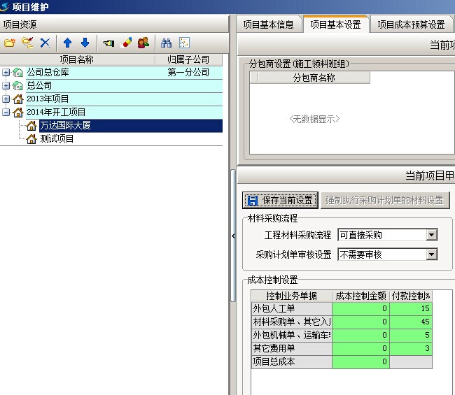 1. 以項(xiàng)目【萬達(dá)國際大廈】為例,首先要給項(xiàng)目設(shè)定一個(gè)控制比例,在工程管理模塊【項(xiàng)目維護(hù)】中,選擇好項(xiàng)目之后,在項(xiàng)目基本設(shè)置中設(shè)置控制比例,這里的控制比例與前面的成本控制金額無關(guān),是人工、材料、機(jī)械、其他費(fèi)在付款時(shí)所占項(xiàng)目收款的控制比例。如下圖:紅框所畫位置為付款控制比例人工費(fèi)占15%、材料費(fèi)占45%、外包機(jī)械和車輛運(yùn)輸占5%、其他費(fèi)3%