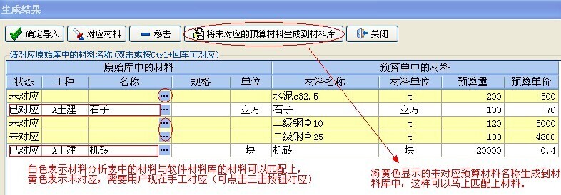 導入完的生成結(jié)果,(由于預算軟件中生成的材料分析表里的材料名稱與實際發(fā)生的材料名稱有些差異,這里需要用戶將未對應的材料做下手工匹配)