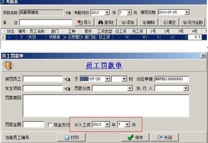 1. 【員工工資】可用于統(tǒng)計(jì)公司管理人員、項(xiàng)目管理人員等固定工作人員的工資成本。員工工資表是根據(jù)員工考勤表生成,每個(gè)項(xiàng)目的考勤可以單獨(dú)錄入,但一個(gè)月份只能生成一張工資表。員工考勤的錄入比較簡單,是按數(shù)字表示出勤情況的,全勤填寫1、半勤填0.5、缺勤填0。如果有遲到、早退、曠工等情況可以填寫員工罰款單來進(jìn)行扣工資。