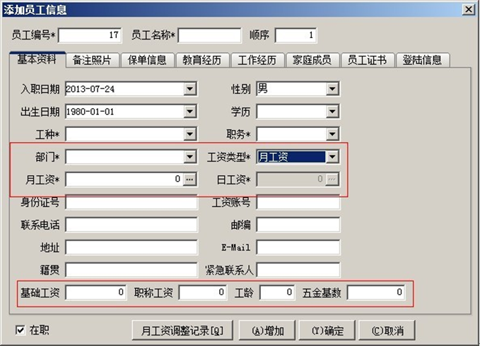 員工工資的計(jì)算方式有月工資和日工資兩種方式(在員工維護(hù)中設(shè)置),按月工資計(jì)算時(shí)工資不受考勤影響,按日工資計(jì)算時(shí),員工工資等于日工資乘以考勤天數(shù)。以上計(jì)算得出的是應(yīng)發(fā)工資,用戶還要根據(jù)自己的實(shí)際情況來編輯公式,得出實(shí)發(fā)工資。下圖所示:員工維護(hù)中有每個(gè)員工固定的月工資、日工資、基礎(chǔ)工資、職稱工資等。