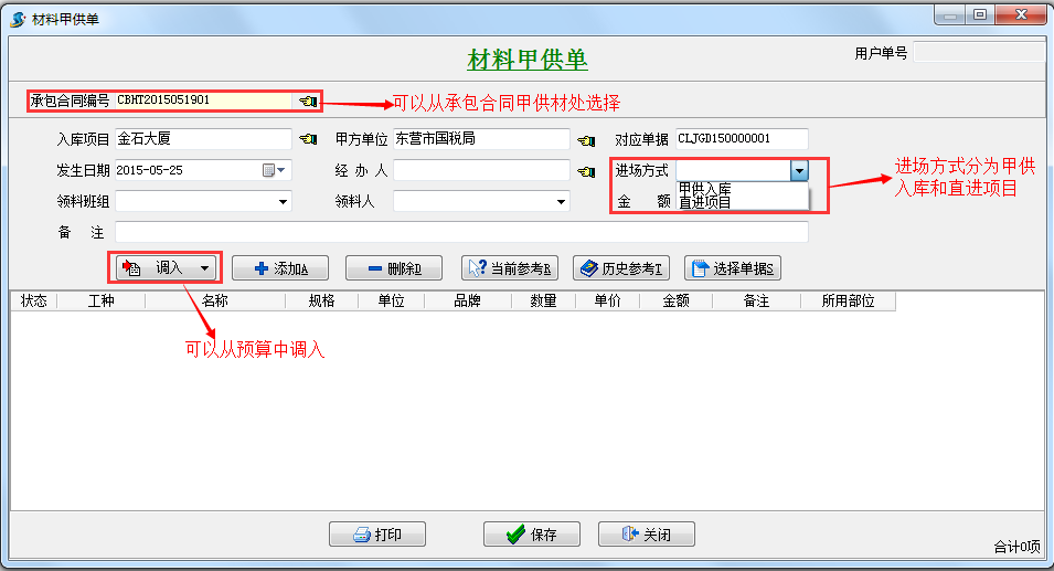 注:大部分【材料甲供單】工程甲供材料管理中在都是有合同依據(jù)的,即選擇承包合同編號,如果不選擇合同編號可能會影響到合同待收付款的計算(當(dāng)前發(fā)生項目對應(yīng)的承包合同中規(guī)定的【甲供材扣除工程款】項打鉤)。