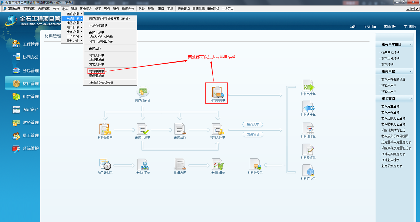 工程甲供材料管理所涉及到的單據(jù)有材料甲供單和承包合同。 【材料甲供單】是登記當(dāng)時發(fā)生項目的甲供供應(yīng)材料的單據(jù)。錄入本單據(jù)前,需先錄入要用到基礎(chǔ)信息中的【材料維護(hù)】、【項目維護(hù)】(包括【庫房信息】、【領(lǐng)料班組信息】)、【往來單位維護(hù)】。