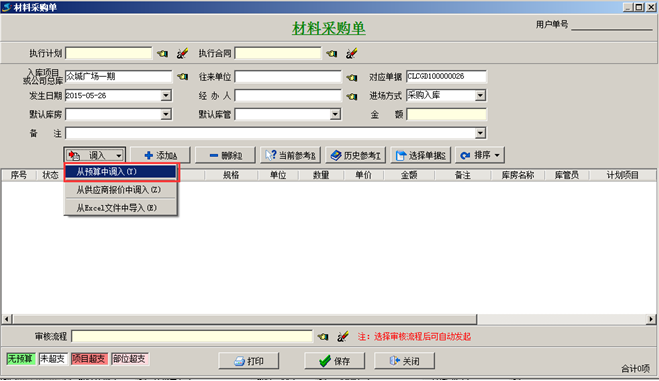 第二步,工程項(xiàng)目材料預(yù)算綁定好之后,在進(jìn)行材料采購(gòu)的時(shí)候可根據(jù)預(yù)算調(diào)入采購(gòu)材料。如果采購(gòu)量超出預(yù)算量,系統(tǒng)會(huì)給出對(duì)應(yīng)的預(yù)警提示,如圖:
