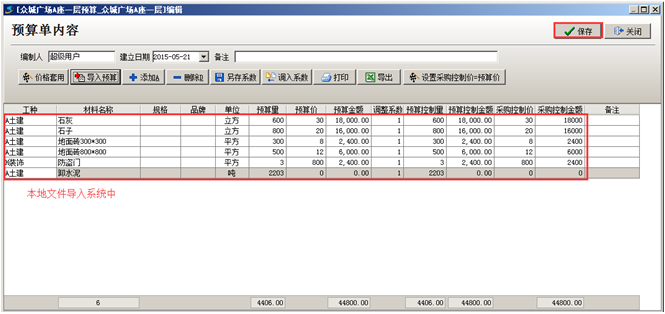 第三步,列名對(duì)應(yīng)好之后點(diǎn)擊[確定],將本地Excel中的內(nèi)容導(dǎo)入到系統(tǒng)中,如果預(yù)算單中存在與原始庫(kù)中未對(duì)應(yīng)的材料,可對(duì)應(yīng)之后[確定導(dǎo)入](對(duì)應(yīng)好之后后期如果有同樣的材料出現(xiàn)可自動(dòng)對(duì)應(yīng)),確定導(dǎo)入之后,文件中的內(nèi)容導(dǎo)入到系統(tǒng)中,點(diǎn)擊[保存]按鈕保存當(dāng)前材料預(yù)算單,如圖: