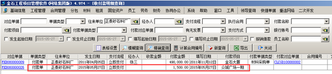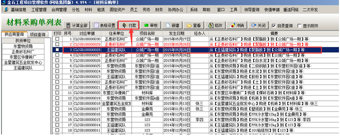 在工地現場材料管理過程中,如果沒有采購合同,材料采購入庫之后,可在“材料入庫單”列表里面,選中單據,直接點擊[付款]按鈕,添加[付款申請單],執(zhí)行付款。如圖: