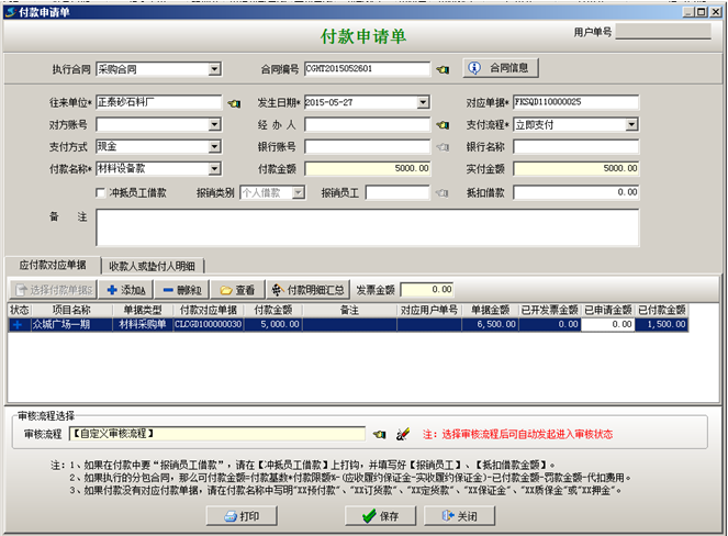 在工地現場材料管理過程中,如果工地現場采購大量材料需要簽訂采購合同并在到貨之前付預付款時,我們要在采購合同中,選中對應的采購合同,點擊[合同付款及相關發(fā)票],點擊[執(zhí)行付款]-[手工填寫]彈出“付款申請單”,在“付款申請單”中選擇執(zhí)行“采購合同”,并選擇對應的“合同編號”,選擇“支付方式”,選擇“付款名稱”為“訂貨款”,并在“付款金額”里面輸入“預付款”金額,“付款申請單”添加完成之后點擊[保存]的按鈕保存單據,如圖: