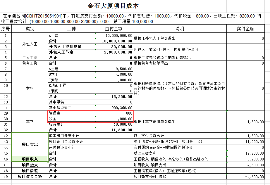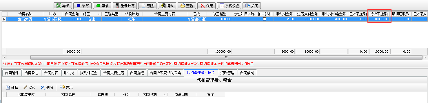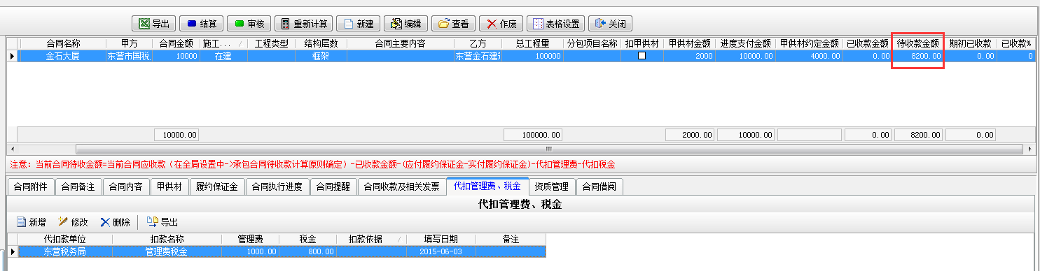 填寫完成【代扣管理費(fèi)稅金】模塊時待收款金額