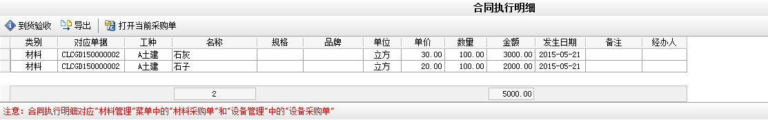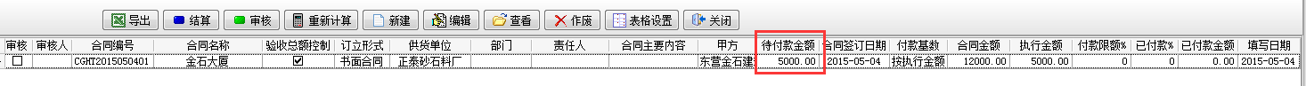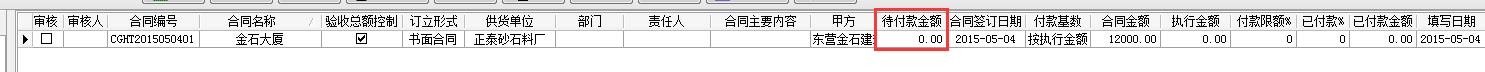 當我們完成石子和石灰個100立方的驗收后待付款金額則顯示驗收金額。如下圖: