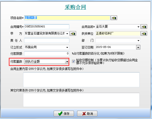 即在工程項目管理系統(tǒng)中新建采購合同時填寫好付款限額。如下圖: