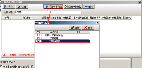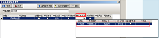 多級審核的單據(jù),在“開啟多級審核”的復(fù)選框內(nèi)打鉤,點(diǎn)擊“添加”的按鈕添加審核流程,依次添加待審崗位以及審核人,如圖: