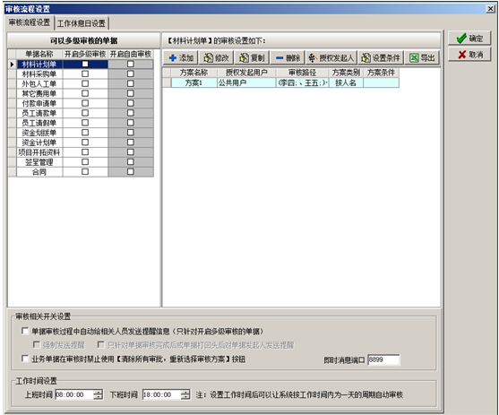 1、先由系統(tǒng)管理員設(shè)置好每個(gè)審核方案的每個(gè)審核級別的審核周期(如1天,2天,1個(gè)工作日,2個(gè)工作日等)、并設(shè)置好每天的上班時(shí)間 和下班時(shí)間。如早8:00 到下午18:00。