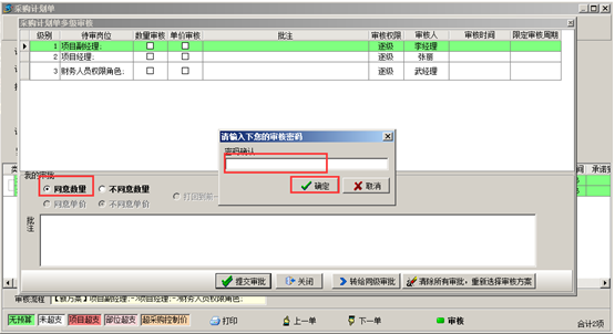 審核人審核時(shí),選擇“我的審核”的選項(xiàng),并輸入審核密碼,點(diǎn)擊“確定”按鈕,選擇下一位審核人,此時(shí)單據(jù)的審核狀態(tài)是“審核中”,如圖所示: