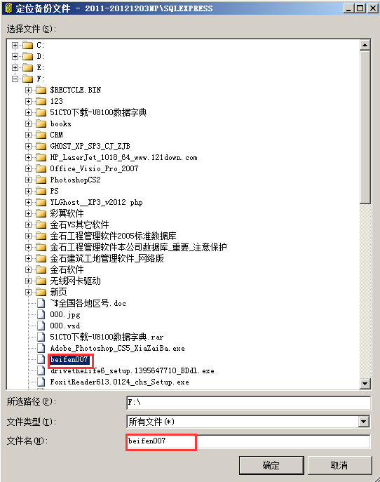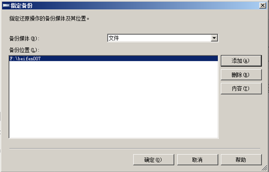 進(jìn)入“指定備份對話框”,點(diǎn)擊“添加”,進(jìn)入指定數(shù)據(jù)庫文件窗口,瀏覽并找到需要還原的數(shù)據(jù)庫備份文件,點(diǎn)擊“確定”, 點(diǎn)擊“確定”后回到指“定備份”對話框,此時(shí)需要還原的文件已經(jīng)列出來了,接著點(diǎn)擊“確定”,返回“還原數(shù)據(jù)庫”。如圖:
