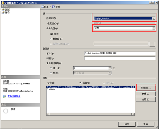 在“對象資源管理器”找到想要進(jìn)行備份的數(shù)據(jù),選中點(diǎn)擊鼠標(biāo)右鍵,點(diǎn)擊“任務(wù)”-“備份”,彈出“備份數(shù)據(jù)庫”的對話框,備份類型選擇“完整”,“目標(biāo)”是備份文件的位置,可以自定義一個(gè)比較好找的目標(biāo),這樣備份以后就可以方便的找到備份文件了,設(shè)置完成點(diǎn)“確定”即可,然后到目標(biāo)目錄下找到備份文件就是所需的備份文件,如圖: