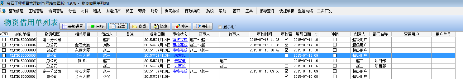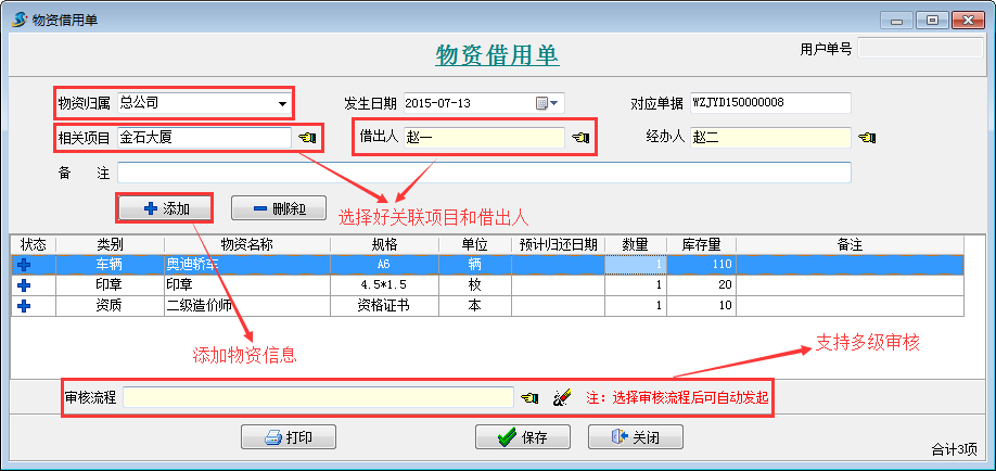 點(diǎn)擊主菜單中的【行政物資】->【物資借用單】打開(kāi)物資借用單列表 點(diǎn)【新建】按鈕,錄入如下:
