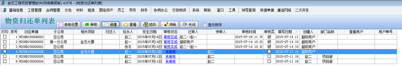 工程項(xiàng)目物資管理可用于管理車輛,印章,證書,資質(zhì),設(shè)備,辦公用品等物資的入庫(kù),報(bào)損,借用,歸還等過(guò)程。錄入相關(guān)單據(jù)前,需先錄入要用到的基礎(chǔ)信息中的【物資維護(hù)】【子公司信息維護(hù)】。