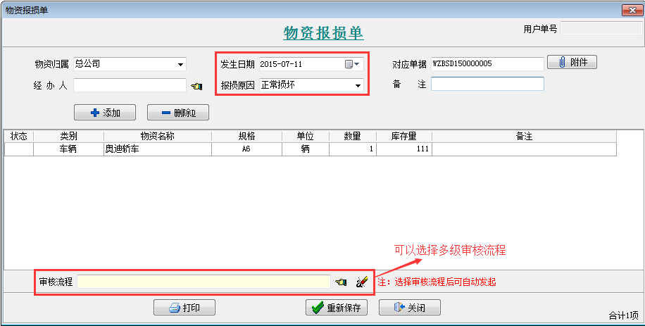 【物資報(bào)損單】是用來(lái)報(bào)損物資的業(yè)務(wù)單據(jù)。 類似【材料報(bào)損單】或者【設(shè)備報(bào)損單】,一個(gè)是針對(duì)物資報(bào)損,一個(gè)是針對(duì)材料或者設(shè)備報(bào)損。