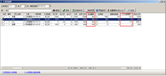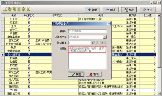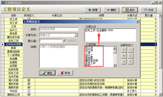 工程項目管理軟件中“五金基數(shù)”及“個人所得稅”在工資項目定義中設(shè)置好之后,在生成工資表時系統(tǒng)會扣除對應(yīng)金額。如圖:
