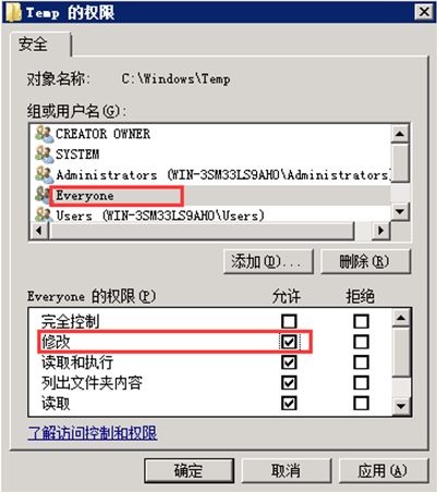 第三步,選中對象“Everyone”,并在權(quán)限中勾選“修改”對應的“允許”復選框。點擊“應用”及“確定”按鈕,如圖;