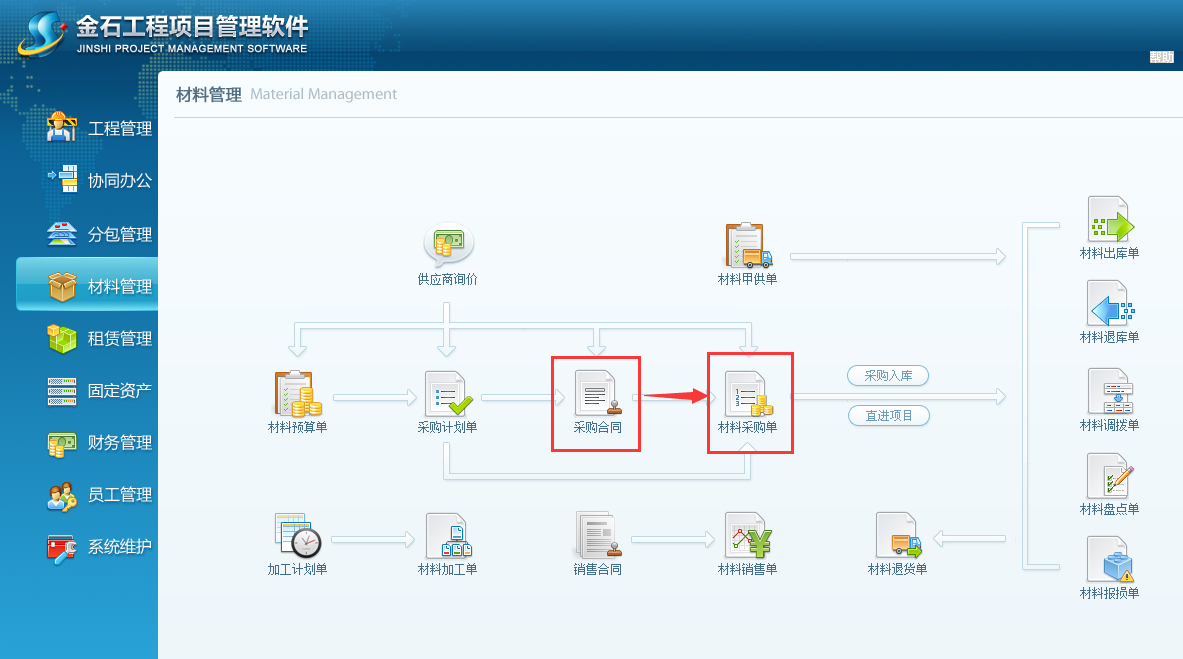 建筑材料管理軟件中材料采購計(jì)劃可以根據(jù)項(xiàng)目對(duì)材料的需求限制材料采購的具體數(shù)量。而材料采購合同可以限制材料采購的金額,兩者的結(jié)合,可實(shí)現(xiàn)了材料采購的量與價(jià)的控制,從而可以利用建筑材料管理軟件的材料管理模塊控制項(xiàng)目的材料成本。
