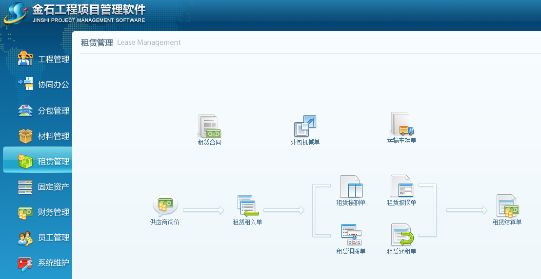 在建筑施工中,材料往往是通過采購或者租賃得來的。所以在建筑材料管理軟件中還要對租賃的材料進行對應的管理。建筑材料管理軟件針對材料租賃過程中的材料租入合同、材料租入、材料租入還租、材料租入報停和材料租賃結算實行一體化流程管理。建筑材料管理軟件中材料租入合同是租賃業(yè)務的指導性文件。合同簽訂之后,租入、歸還、報停的后續(xù)操作都圍繞合同而開展,甚至在進行租入結算時軟件會自動調(diào)用租入合同所采用的“日期計算方式”和所擬定的“日租金單價”。