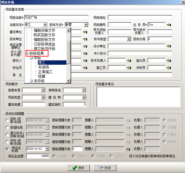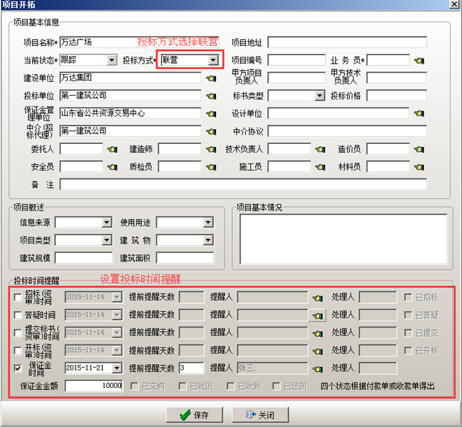 項目狀態(tài)編輯維護完成之后可在工程管理軟件中建立項目。在工程管理軟件的“項目開拓”中輸入包括個往來單位以及負責人等項目基本信息。也可在投標時間提醒里面設置“招標(資審)時間”,“答疑時間”,“提交標書時間”,“開標時間”,“保證金”提醒時間,時間設置完成之后,被提醒的用戶會在相應的時間收到相關的提醒內容。投標保證金,在投標保證金對應的復選框打鉤,設置投標保證金的時間,提前提醒的天數,被提醒人以及金額。如圖所示: