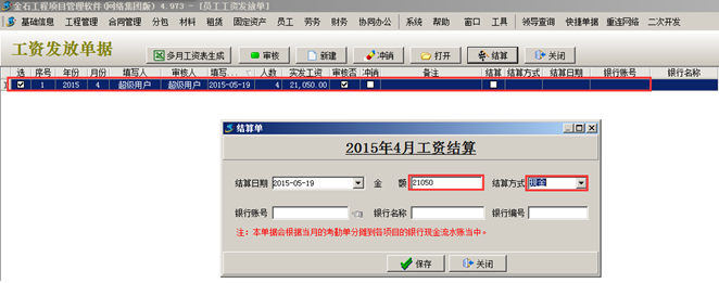工程管理軟件中結(jié)算完成之后,對(duì)應(yīng)的員工工資信息會(huì)顯示結(jié)算完成的顏色,并且可查詢到對(duì)應(yīng)工資流水,如圖: