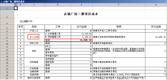 “眾城商場(chǎng)一期”項(xiàng)目成本-“工人工資”,如圖: