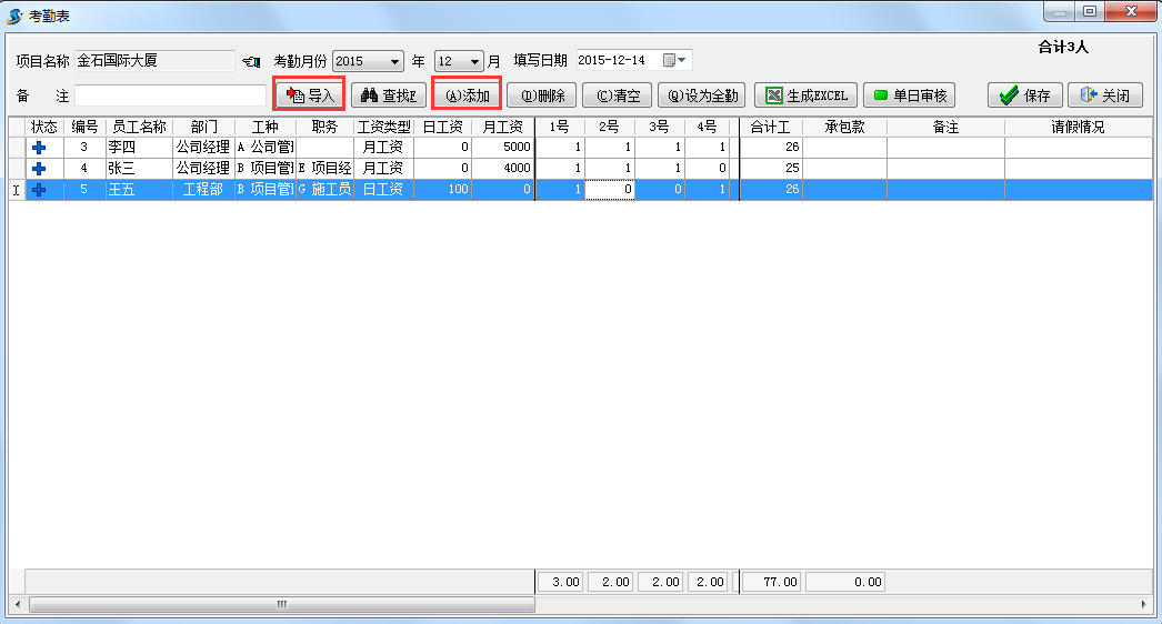 在工程管理軟件只記錄每人每月的合計(jì)工考勤,考勤單不區(qū)分項(xiàng)目,合計(jì)工填寫在考勤表的任意一天即可。