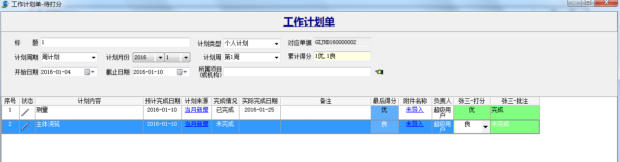打分規(guī)則設置完成后,相應的打分人就可以對工作計劃進行打分。待打分的單據(jù)會在相應待打分人審核中心里提示。如下圖:
