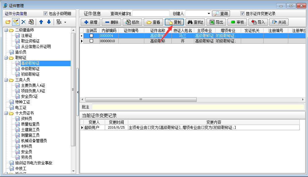 顯示證件變更記錄打勾,選擇修改(主要用于增加證件專業(yè)、所屬部門等信息的變更)