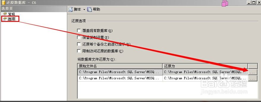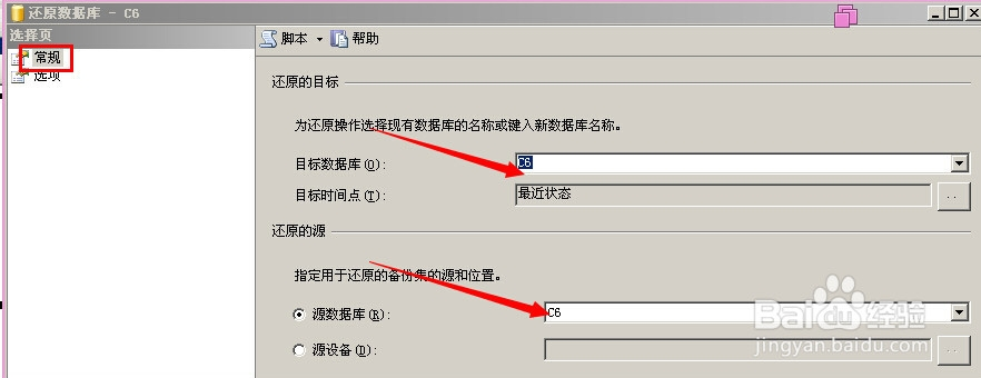 6、彈出還原數(shù)據(jù)庫窗口,在常規(guī)中檢查目標(biāo)數(shù)據(jù)庫名稱與源數(shù)據(jù)庫名稱是否正確、在選項中找到備份的數(shù)據(jù)庫文件