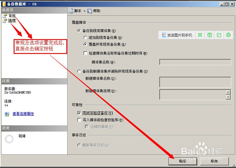 4、彈出備份數(shù)據(jù)庫窗口,在常規(guī)中設(shè)置保存路徑,步驟為首先點擊左邊的常規(guī),然后點擊添加,在彈出框中點擊省略號選擇文件的保存,后綴名稱為.bak,填寫完成之后,點擊確定