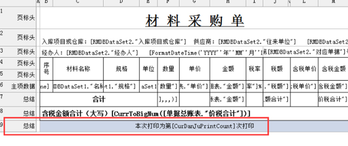 設(shè)置完成后,操作者在生成表格時(shí),可在尾欄插入【數(shù)據(jù)字段】-本次打印為第[CurDanJuPrintCount]打印,示意如下: