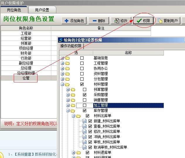 保存之后 ,選擇該崗位,再來設置這個崗位角色的【權限】。