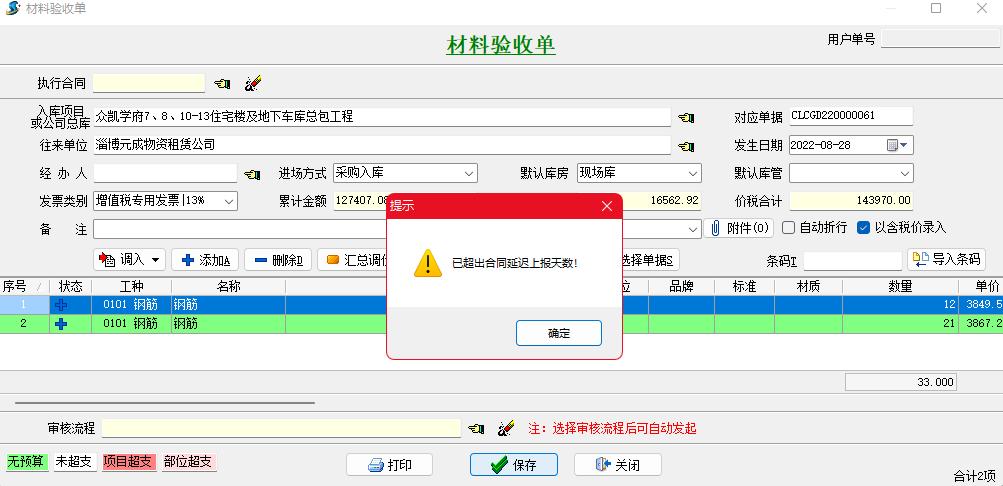 為了控制單據(jù)延遲上報時間,金石工程項目管理軟件專門開發(fā)了機(jī)械日報單、材料采購單、外包機(jī)械單、其它費用單、外包人工單、采購變更單、分包變更單、租賃變更單、其它變更單、銷售變更單等單據(jù)延遲上報天數(shù)設(shè)置。也就是企業(yè)可以自定義單據(jù)延遲上報天數(shù),單據(jù)發(fā)生日期超出上報天數(shù)時不允許保存。