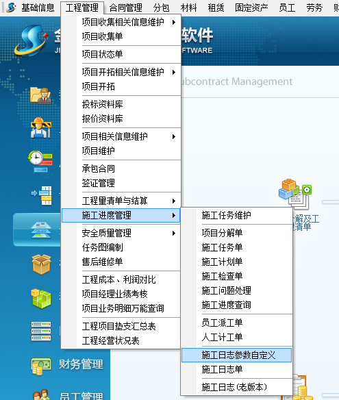 二、工程項目管理軟件施工日志自定義:菜單欄 “工程管理模塊”→“施工進度管理” →“施工日志參數(shù)自定義”