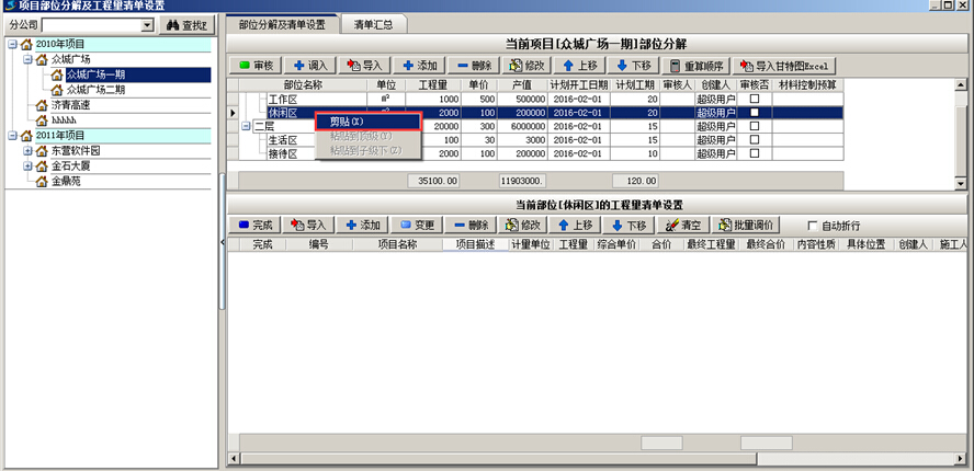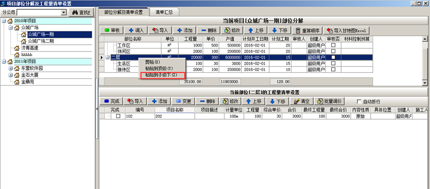 工程項(xiàng)目管理系統(tǒng)中已維護(hù)好的項(xiàng)目部位可進(jìn)行剪切粘貼的操作?!凹羟小睍r(shí)選中要變動的部位,點(diǎn)擊鼠標(biāo)右鍵選擇“剪切”,“粘貼”時(shí)選中項(xiàng)目部位,點(diǎn)擊鼠標(biāo)右鍵,選擇“粘貼到頂級下”或“粘貼到子級下”,如圖: