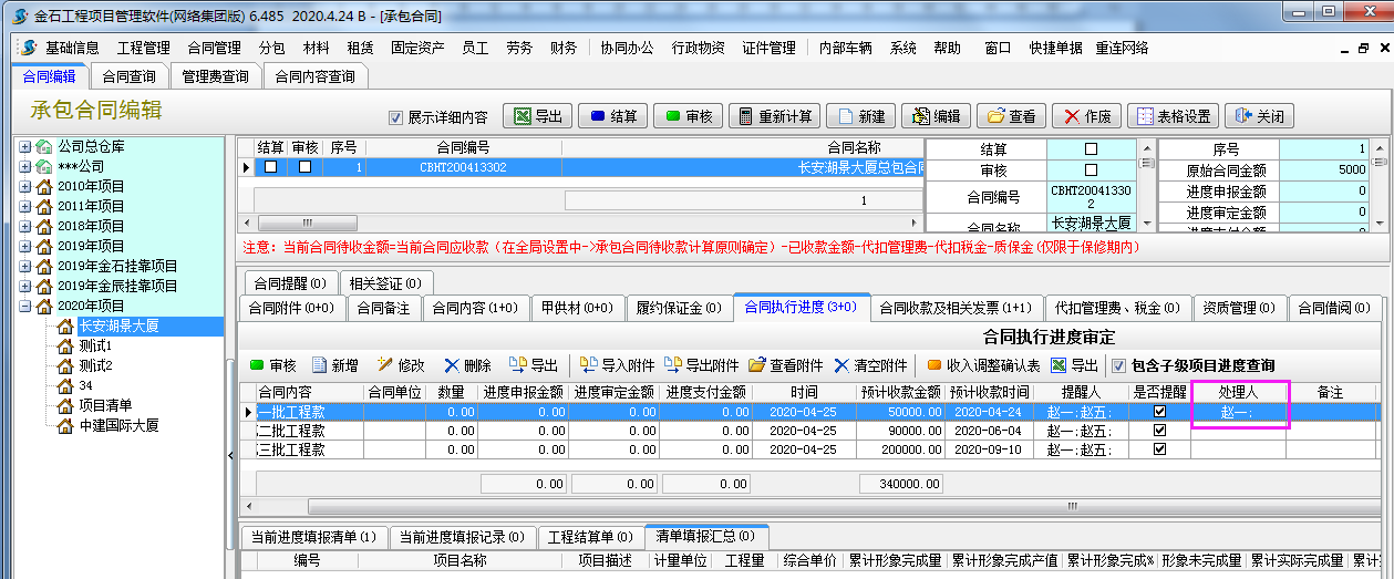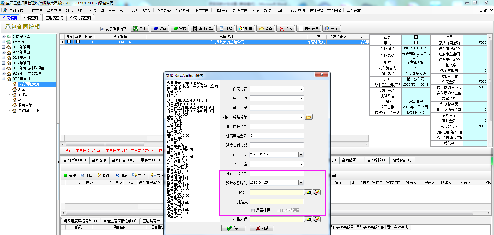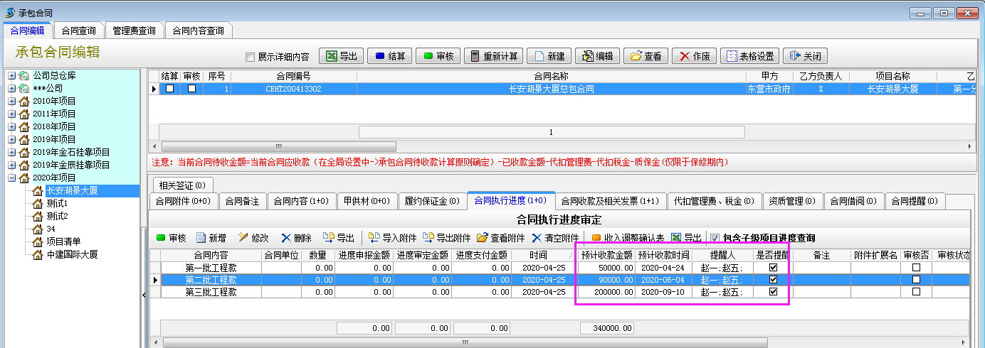 1、在【工程管理】-【承包合同】-合同執(zhí)行進(jìn)度,點(diǎn)擊新增,填寫預(yù)計收款金額、預(yù)計收款時間、提醒人、是否提醒。