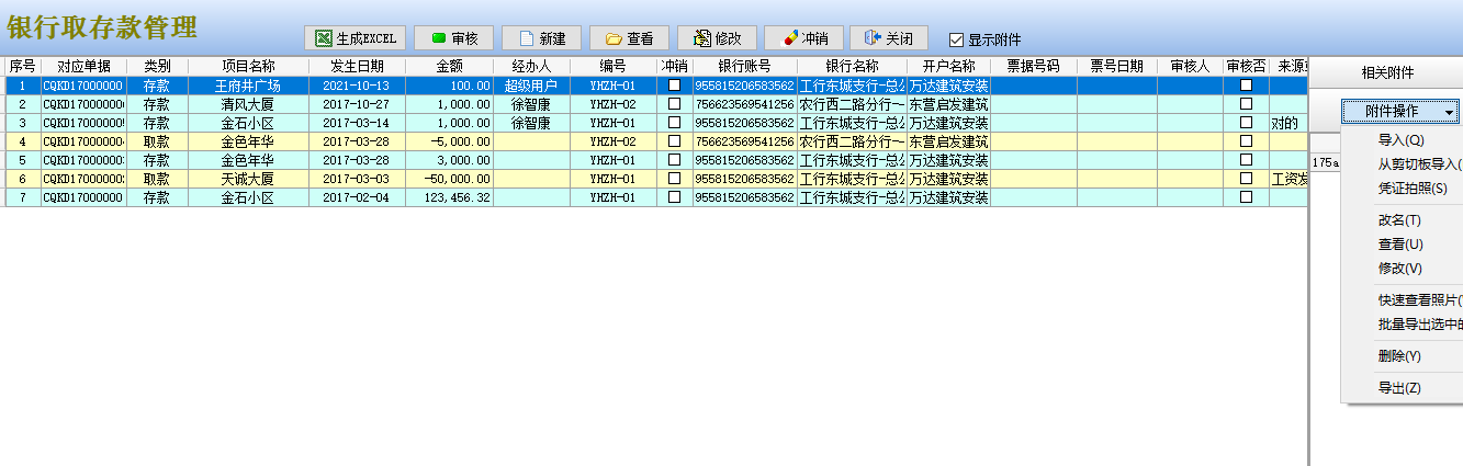 銀行存取款管理,右側(cè)增加附件的導(dǎo)入等功能。支持附件的導(dǎo)入,刪除等功能。