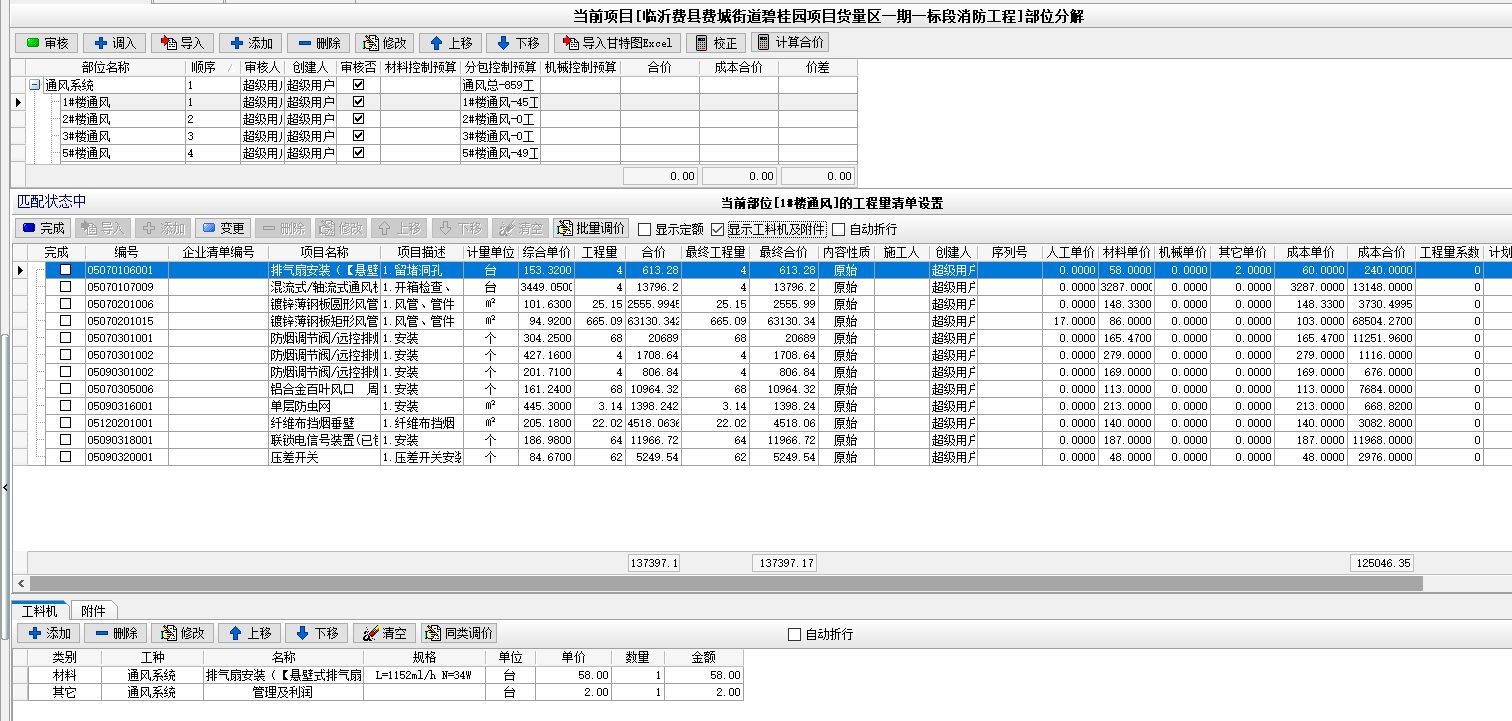 對(duì)應(yīng)部位下的清單設(shè)置,增加了‘成本單價(jià)’和‘成本合價(jià)’兩個(gè)字段,‘成本單價(jià)’=‘人工單價(jià)’+‘材料單價(jià)’+‘機(jī)械單價(jià)’+‘其他單價(jià)’;‘成本合價(jià)’=‘工程量’*‘成本單價(jià)’。下方工料機(jī)體現(xiàn)了材料單價(jià)、機(jī)械單價(jià)、人工單價(jià)和其他單價(jià)的計(jì)算來(lái)源,‘材料單價(jià)’=‘?dāng)?shù)量’*‘單價(jià)’,人工單價(jià)等其他類型的單價(jià)亦如此。