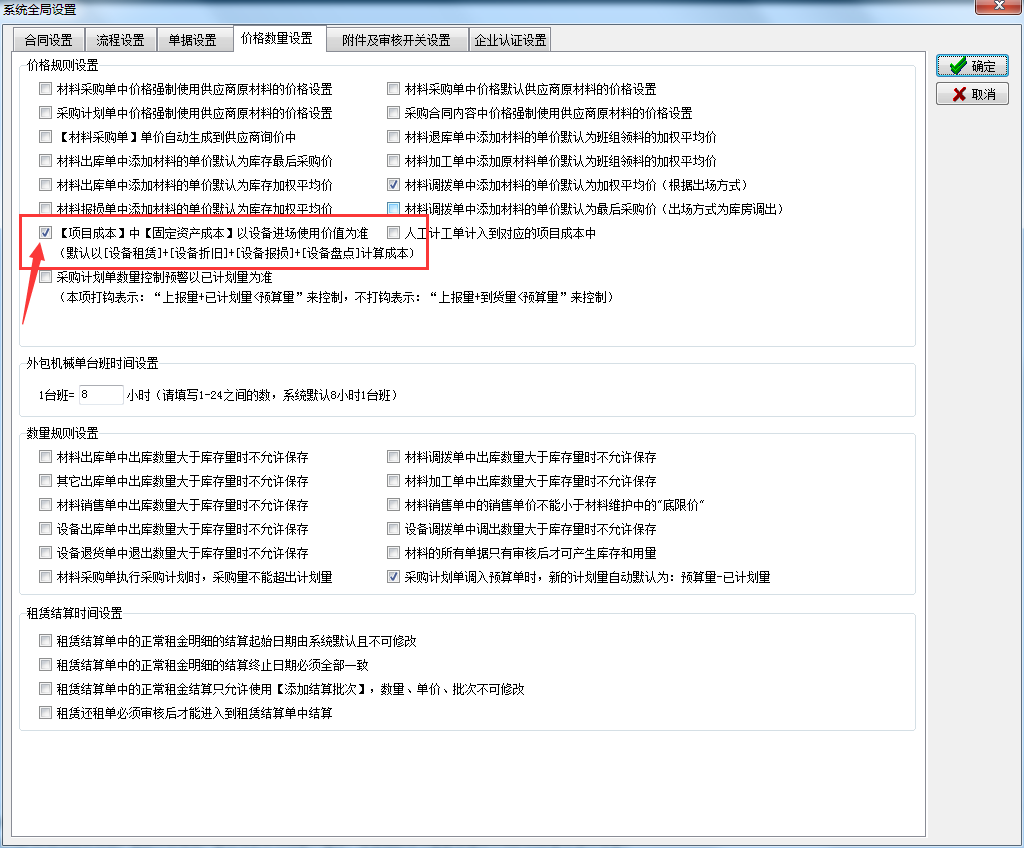 在工程項(xiàng)目管理軟件【系統(tǒng)維護(hù)】-【系統(tǒng)全局設(shè)置】-【價(jià)格數(shù)量設(shè)置中】有設(shè)備計(jì)算成本方式的控制開(kāi)關(guān),如下圖: