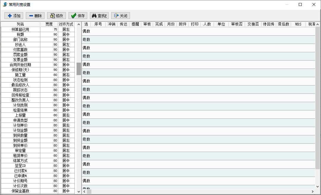 六、常用列寬設置 - 對列表或查詢表格中不同字段的列寬做單獨設置,分字段名、寬度和對齊方式3種設置,字段名必須與列表或查詢表格中的字段名一致,否則無法生效;寬度為字段的顯示寬度,原則為恰好或更好顯示當前字段內(nèi)容為準;對齊方式分居中、居左和居右3種方式,原則上推薦數(shù)字類居右顯示,其他字段可根據(jù)用戶個體習慣自行設置,設置界面圖如下:
