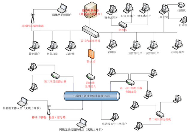 《金石建筑工地管理系統(tǒng)》在綜合了建筑企業(yè)在網(wǎng)絡(luò)辦公要求后,實(shí)結(jié)合了該公司的實(shí)際需求建立了如上圖所示的公司辦公平臺(tái)。在硬件上,使用最經(jīng)濟(jì)、性價(jià)比較高、安全性很強(qiáng)的設(shè)備建立既能滿足公司現(xiàn)階段需求有能符合將來一段時(shí)間內(nèi)的信息化需要的硬件設(shè)施,并為公司以后硬件及信息化發(fā)展預(yù)留充裕的空間及相關(guān)接口。在軟件上建立專門的對(duì)內(nèi)和對(duì)外的信息通道,對(duì)內(nèi)串聯(lián)公司各科室部門,對(duì)項(xiàng)目部進(jìn)行有效監(jiān)管,并為項(xiàng)目部提供高效的上報(bào)及反應(yīng)通道,實(shí)現(xiàn)公司內(nèi)部的信息高速互通;對(duì)外建立公司的信息發(fā)布平臺(tái),及時(shí)的為公司相關(guān)外來的單位發(fā)布公司及項(xiàng)目信息。