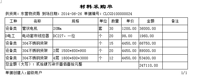 以下圖中單據(jù)(材料采購單)為例,新建一個打印報表。