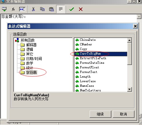 再來插入一個大寫,累計金額。同樣是選擇插入函數(shù),選擇字符串中的,CurrtoBigNum, 點繼續(xù)按鈕,然后把之前得出的結果[Sum([單據(jù)明細表."金額"],,,)]復制到里面。