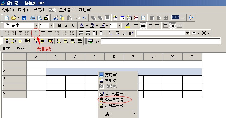 4. 首先我們選中A 列或第一行、第二行后,點擊工具欄的無框線按鈕,把第一行和A列的邊框隱藏掉。然后我們點擊鼠標右鍵,使用【合并單元格】合并第一行、第二行的單元格。