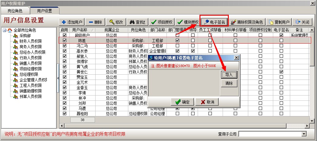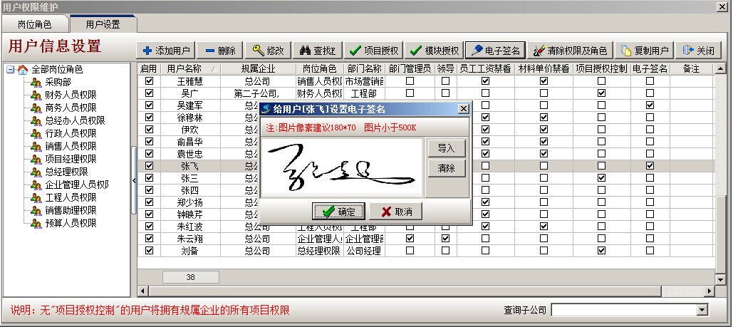 登陸超級用戶,選擇系統(tǒng)維護(hù)模塊,打開用戶管理權(quán)限設(shè)置,選擇需要設(shè)置電子簽名的用戶,點上面的電子簽名,對應(yīng)導(dǎo)入提前設(shè)置好的電子簽名圖片(jpg格式)