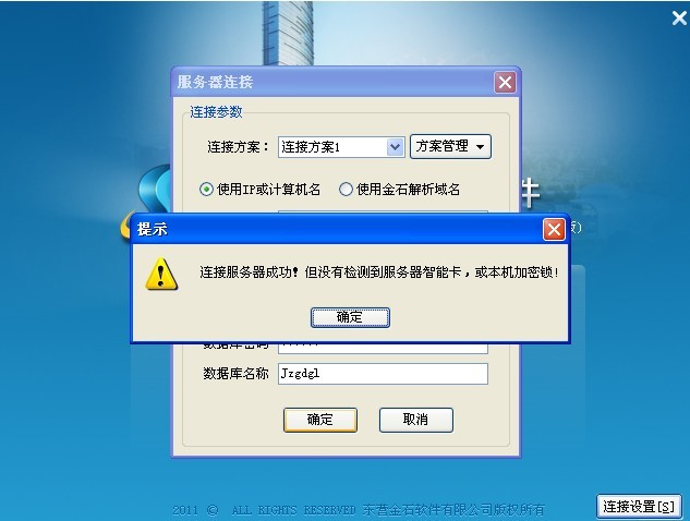 試用版或加密鎖沒插好,則會提示連接服務(wù)器成功!但沒有檢測到服務(wù)器智能卡,或本機機密鎖